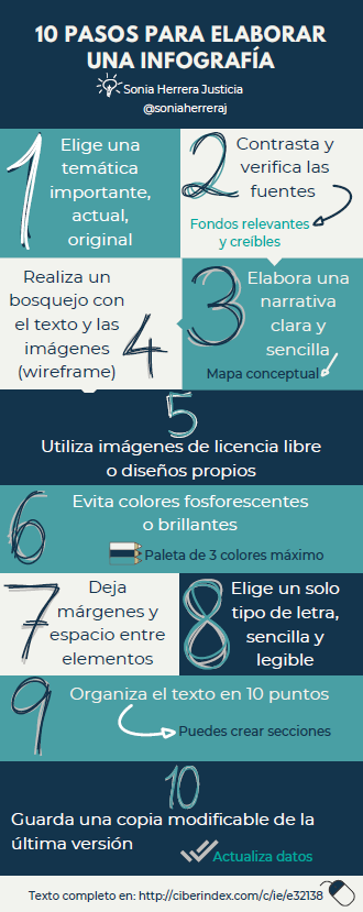 Herrera Justicia, Sonia. 10 pasos para elaborar una Infografía. Index Enfermería. 2019; 28(3): 138. Disponible en: https://ciberindex.com/c/ie/e32138