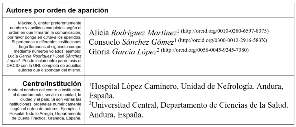 - Si dispone de ORCID, incluya la URL completa del mismo detrás de cada autor, entre paréntesis y con letra superíndice, tal como aparece en la anterior ilustración.